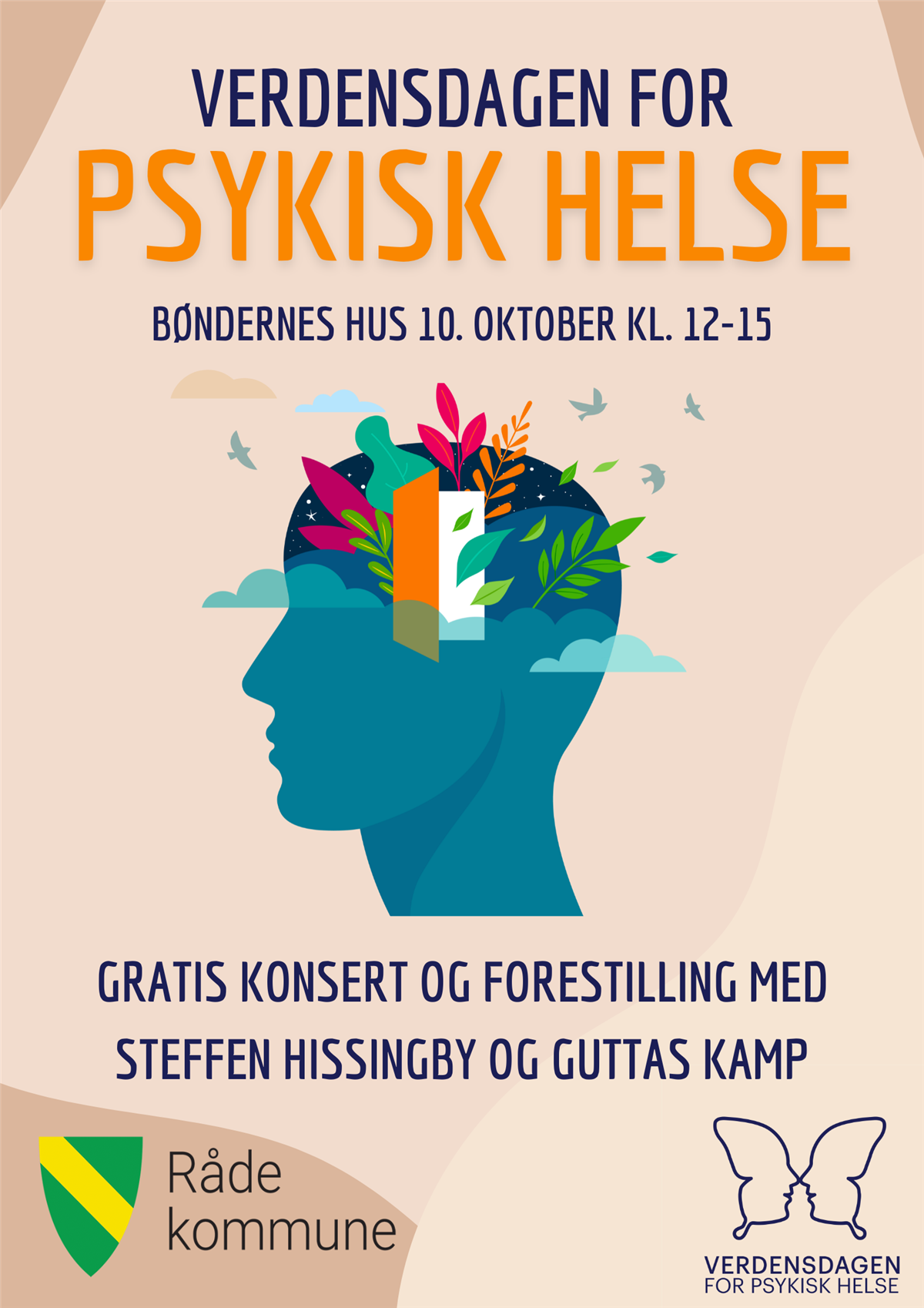Plakat for kommunens markering av verdensdagen for psykisk helseFredag 10. oktober er det verdensdagen for psykisk helse. Råde kommune markerer dagen med et arrangement på Bøndernes hus, med konsert med Steffen Hissingby og forestilling med Guttas kamp.