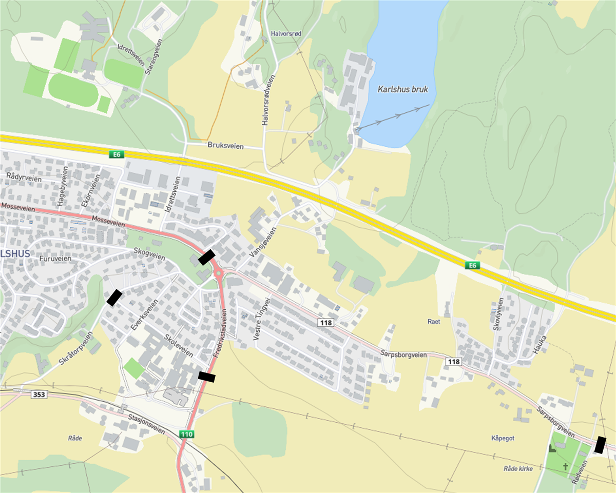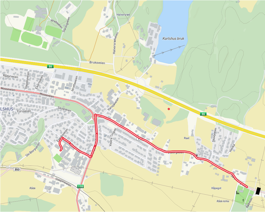 Togtrasé barnetoget: Råde kirke – Sarpsborgveien – Fredrikstadveien – Skoleveien – Karlshus skole.